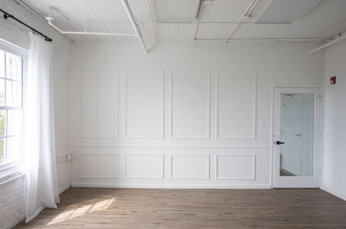 This large rental photo studio features both a grey textured wall and a white elegant Wainscoting wall with included white modern couch and chic armchair. This photo studio also features large windows that provide beautiful soft light and stunning view of the downtown area.